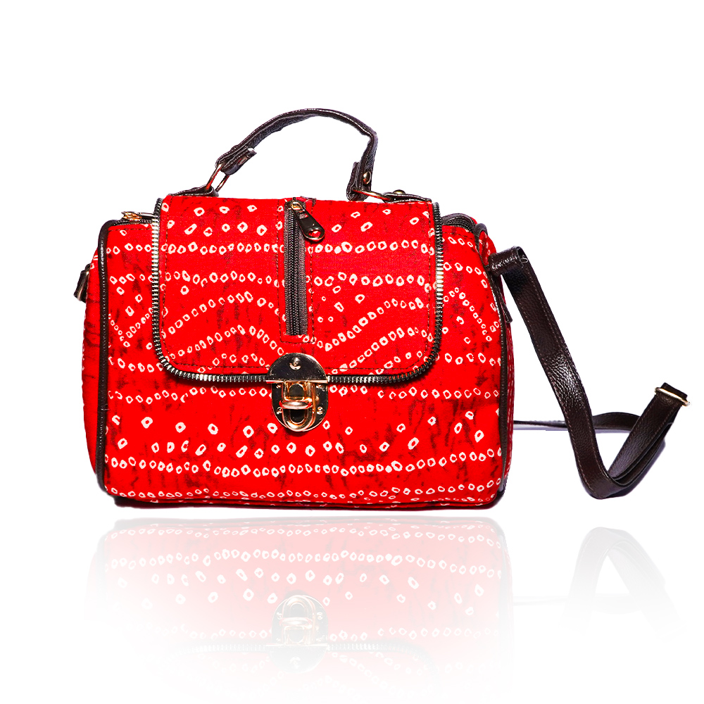 - A stylish red and white Bandhani print sling bag with a brown strap. A perfect combination of traditional charm and modern design for casual outings.